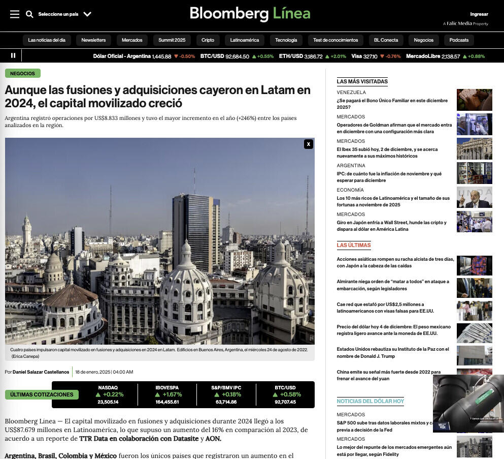 Bloomberg Línea — El capital movilizado en fusiones y adquisiciones durante 2024 llegó a los US$87.679 millones en Latinoamérica, lo que supuso un aumento del 16% en comparación al 2023, de acuerdo a un reporte de TTR Data en colaboración con Datasite y AON.