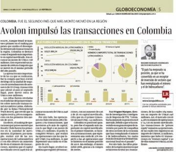 Colombia se posicionó quinto, pero fue el segundo más importante en capital movilizado. En el primer trimestre, se hicieron 29 transacciones, que representaron una caída de 37% respecto a las 46 operaciones que se hicieron en el mismo periodo de 2016. Sin embargo, el monto subió 266%, gracias a la compra de Avolon.