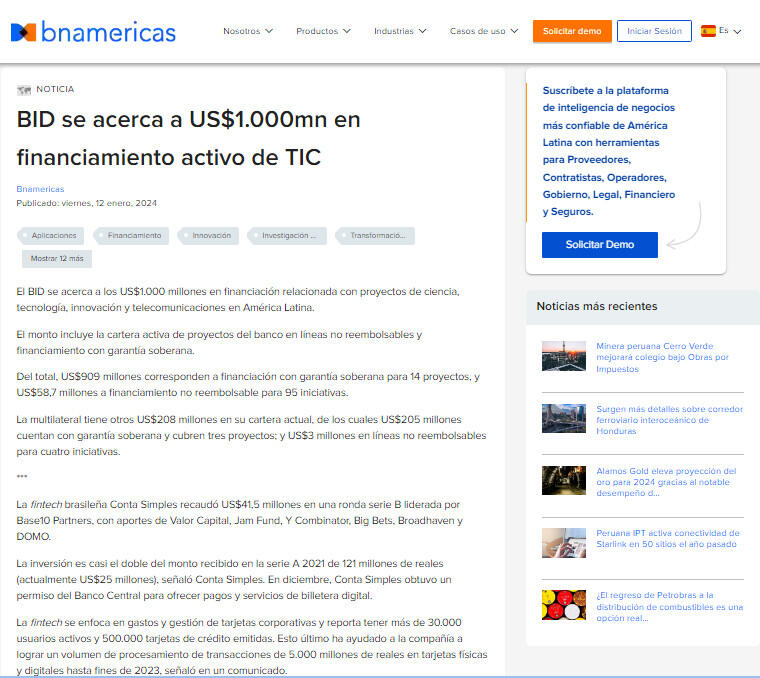 BID se acerca a US$1.000mn en financiamiento activo de TIC