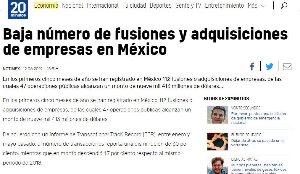 De acuerdo con un informe de Transactional TracK Record (TTR), entre enero y mayo pasado, el número de transacciones reporta una disminución de 30 por ciento, mientras que en monto descendió 1.7 por ciento respecto al mismo periodo de 2018.