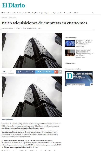 El mercado de fusiones y adquisiciones en México registró 17 operaciones en abril de 2018, de las cuales nueve suman un importe de 463 millones de dólares, de acuerdo con el informe mensual de Transactional Track Record (TTR).