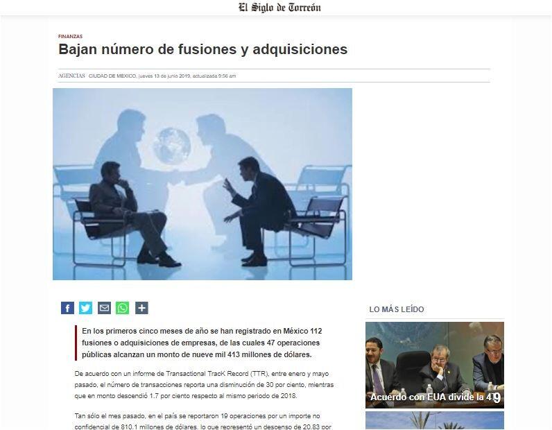 De acuerdo con un informe de Transactional TracK Record (TTR), entre enero y mayo pasado, el número de transacciones reporta una disminución de 30 por ciento, mientras que en monto descendió 1.7 por ciento respecto al mismo periodo de 2018.