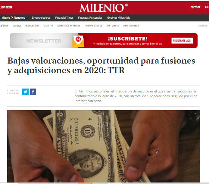 En términos sectoriales, el financiero y de seguros es el que más transacciones ha contabilizado a lo largo de 2020, con un total de 10 operaciones, seguido por el de Internet con ocho. https://www.milenio.com/negocios/ttr-bajas-valoraciones-oportunidad-fusiones-adquisiciones