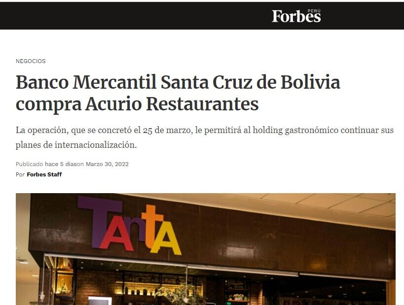 La operación, cerrada el 25 de marzo pasado, se concretó luego de que la firma de gestión de inversiones y bienes raíces Colony Capital vendiera su participación en Acurio Restaurantes al mencionado banco boliviano, según informó hoy el periódico peruano Gestión, citando datos de Transactional Track Record (TTR). La venta también se efectuó a un inversionista particular, informó.