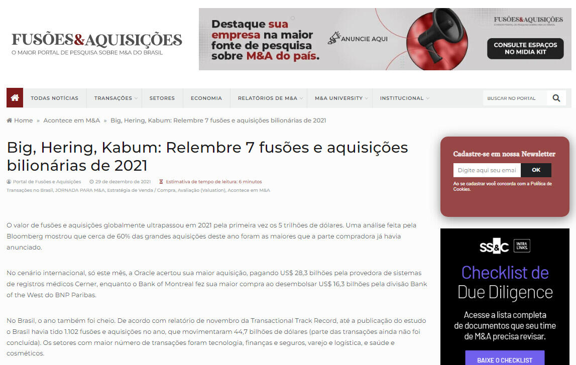 O valor de fusões e aquisições globalmente ultrapassou em 2021 pela primeira vez os 5 trilhões de dólares. Uma análise feita pela Bloomberg mostrou que cerca de 60% das grandes aquisições deste ano foram as maiores que a parte compradora já havia anunciado.
