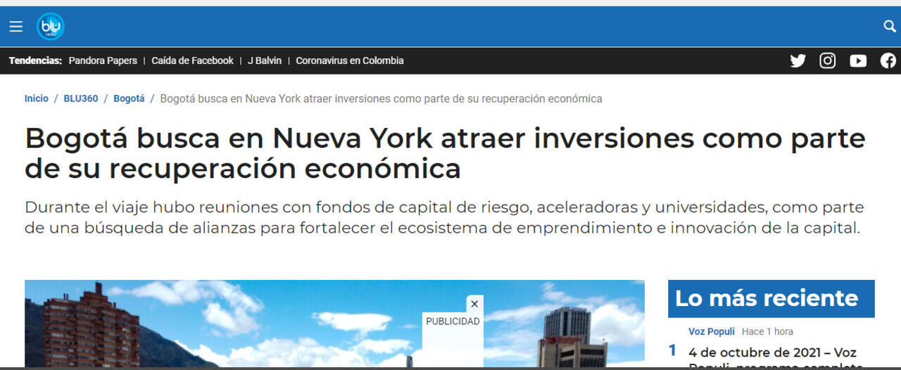 Autoridades de Bogotá hicieron esta semana una gira en Nueva York con el objetivo de atraer inversiones en los sectores de infraestructura, industrias creativas, salud y emprendimiento como parte de su recuperación económica por los efectos de la pandemia de la covid-19.