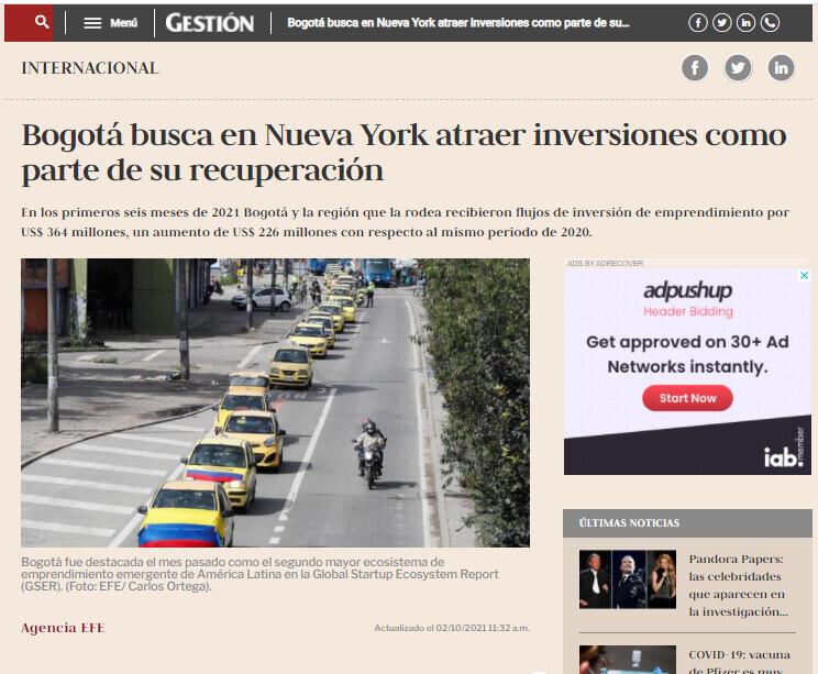 En los primeros seis meses de 2021 Bogotá y la región que la rodea recibieron flujos de inversión de emprendimiento por US$ 364 millones, un aumento de US$ 226 millones con respecto al mismo periodo de 2020.