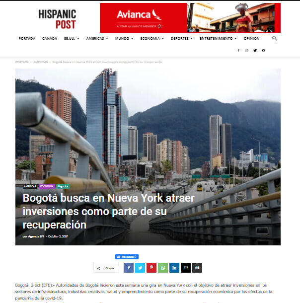 Autoridades de Bogotá hicieron esta semana una gira en Nueva York con el objetivo de atraer inversiones en los sectores de infraestructura, industrias creativas, salud y emprendimiento como parte de su recuperación económica por los efectos de la pandemia de la covid-19.