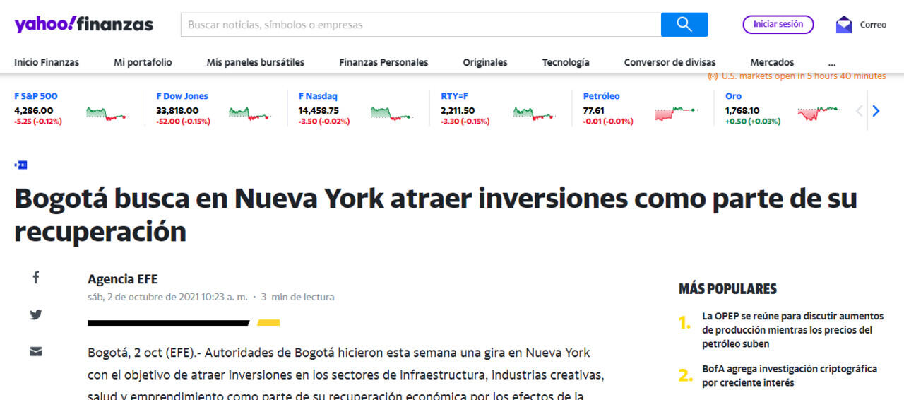 Autoridades de Bogotá hicieron esta semana una gira en Nueva York con el objetivo de atraer inversiones en los sectores de infraestructura, industrias creativas, salud y emprendimiento como parte de su recuperación económica por los efectos de la pandemia de la covid-19.
