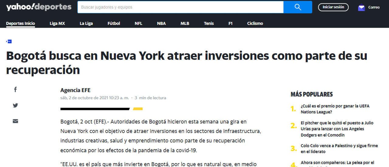 Autoridades de Bogotá hicieron esta semana una gira en Nueva York con el objetivo de atraer inversiones en los sectores de infraestructura, industrias creativas, salud y emprendimiento como parte de su recuperación económica por los efectos de la pandemia de la covid-19.
