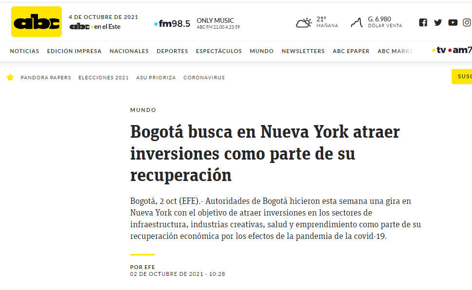 Autoridades de Bogotá hicieron esta semana una gira en Nueva York con el objetivo de atraer inversiones en los sectores de infraestructura, industrias creativas, salud y emprendimiento como parte de su recuperación económica por los efectos de la pandemia de la covid-19.