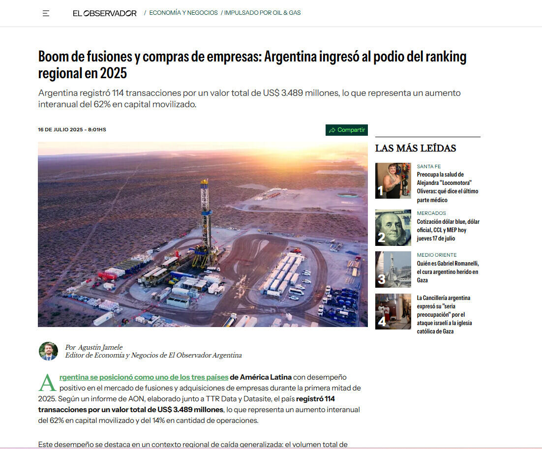 Argentina se posicionó como uno de los tres países de América Latina con desempeño positivo en el mercado de fusiones y adquisiciones de empresas durante la primera mitad de 2025. Según un informe de AON, elaborado junto a TTR Data y Datasite, el país registró 114 transacciones por un valor total de US$ 3.489 millones, lo que representa un aumento interanual del 62% en capital movilizado y del 14% en cantidad de operaciones.