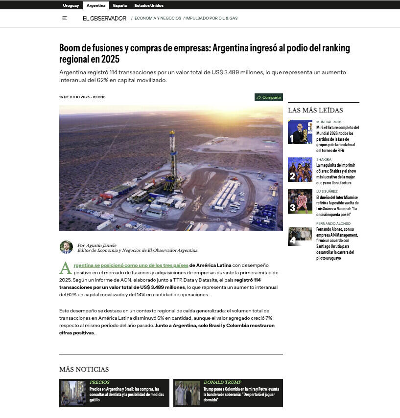 Argentina se posicionó como uno de los tres países de América Latina con desempeño positivo en el mercado de fusiones y adquisiciones de empresas durante la primera mitad de 2025. Según un informe de AON, elaborado junto a TTR Data y Datasite, el país registró 114 transacciones por un valor total de US$ 3.489 millones, lo que representa un aumento interanual del 62% en capital movilizado y del 14% en cantidad de operaciones.