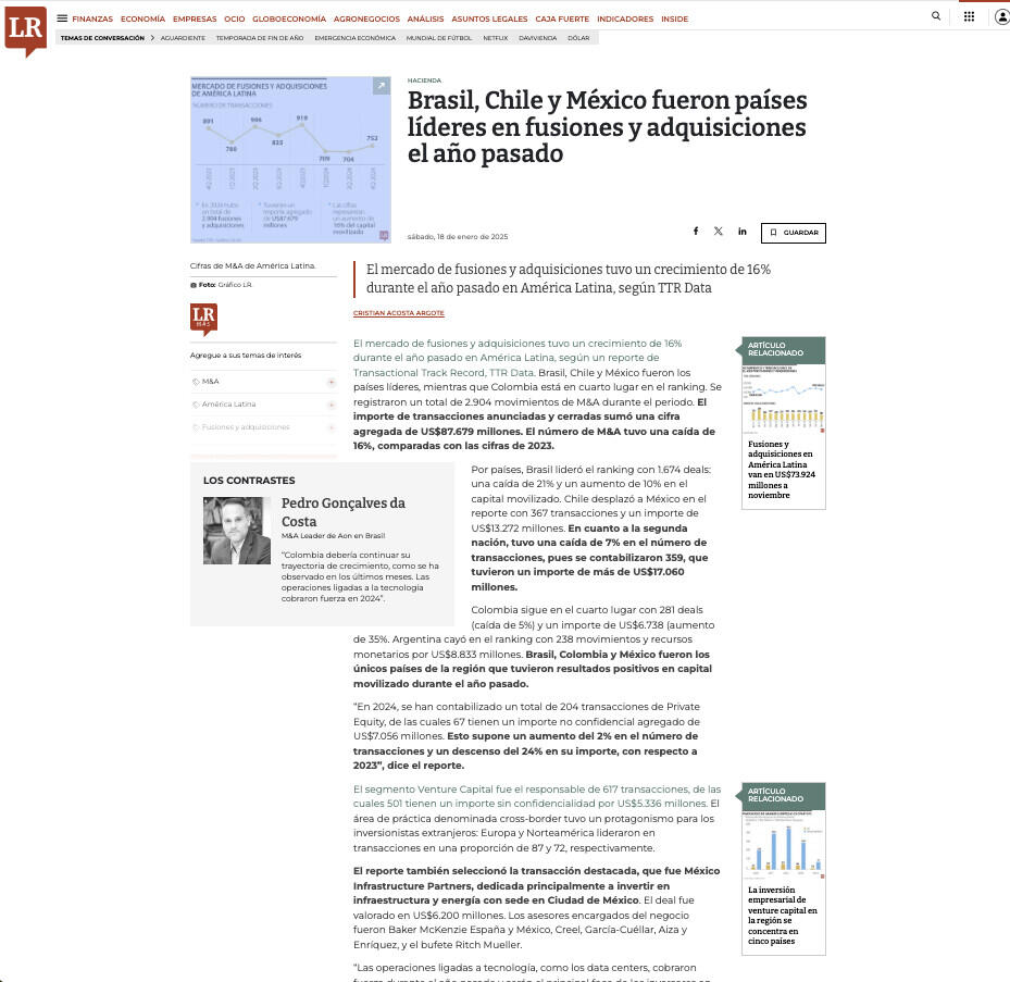 “Las operaciones ligadas a tecnología, como los data centers, cobraron fuerza durante el año pasado y serán el principal foco de los inversores en los próximos años. La Transición Energética también sigue siendo un tema sumamente relevante, que atrae inversiones internacionales a América Latina. Brasil, México y Chile deberían permanecer en el liderazgo de la inversión en 2025”, aseguró Pedro Gonçalves da Costa, M&A and Transaction Solutions Leader de Aon en Brasil.