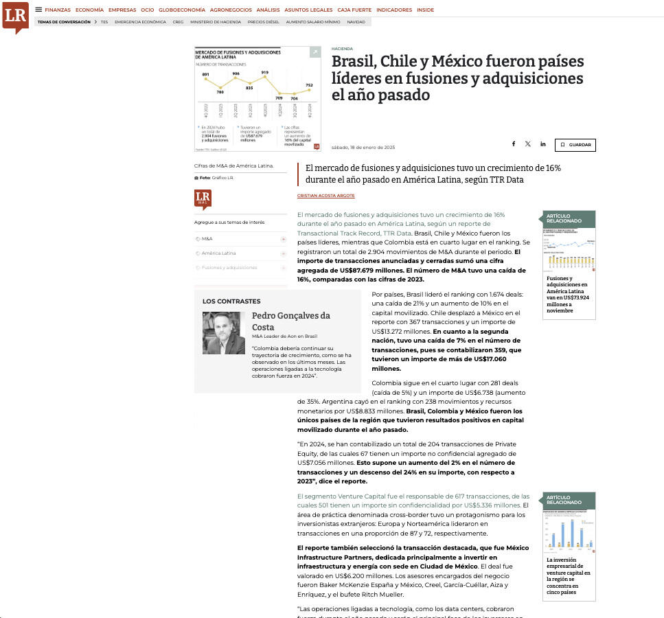 “Las operaciones ligadas a tecnología, como los data centers, cobraron fuerza durante el año pasado y serán el principal foco de los inversores en los próximos años. La Transición Energética también sigue siendo un tema sumamente relevante, que atrae inversiones internacionales a América Latina. Brasil, México y Chile deberían permanecer en el liderazgo de la inversión en 2025”, aseguró Pedro Gonçalves da Costa, M&A and Transaction Solutions Leader de Aon en Brasil.