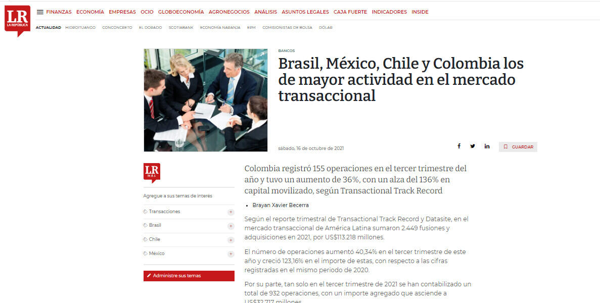 Colombia registró 155 operaciones en el tercer trimestre del año y tuvo un aumento de 36%, con un alza del 136% en capital movilizado, según Transactional Track Record