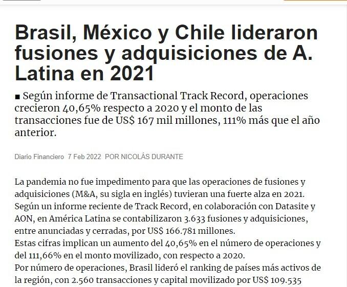 Brasil, México y Chile lideraron fusiones y adquisiciones de A. Latina en 2021