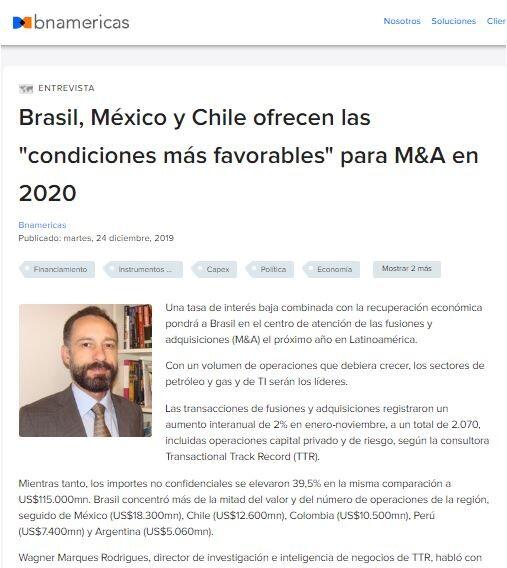 Rodrigues: Brasil, México y Chile tienen las condiciones más favorables para la dinámica de las transacciones en la región. Por otro lado, se puede anticipar caídas considerables en Argentina porque es probable que la tendencia a la baja observada en 2019 continúe en el próximo año debido a la incertidumbre económica y política que este mercado ha experimentado en los últimos meses.
