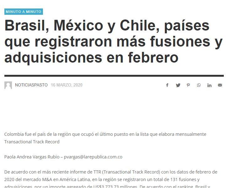 De acuerdo con el más reciente informe de TTR (Transactional Track Record) con los datos de febrero de 2020 del mercado M&A en América Latina, en la región se registraron un total de 131 fusiones y adquisiciones, por un importe agregado de US$3.773,73 millones. De acuerdo con el ranking, Brasil y México lideraron en este conteo con 156 y 42 operaciones; respectivamente.