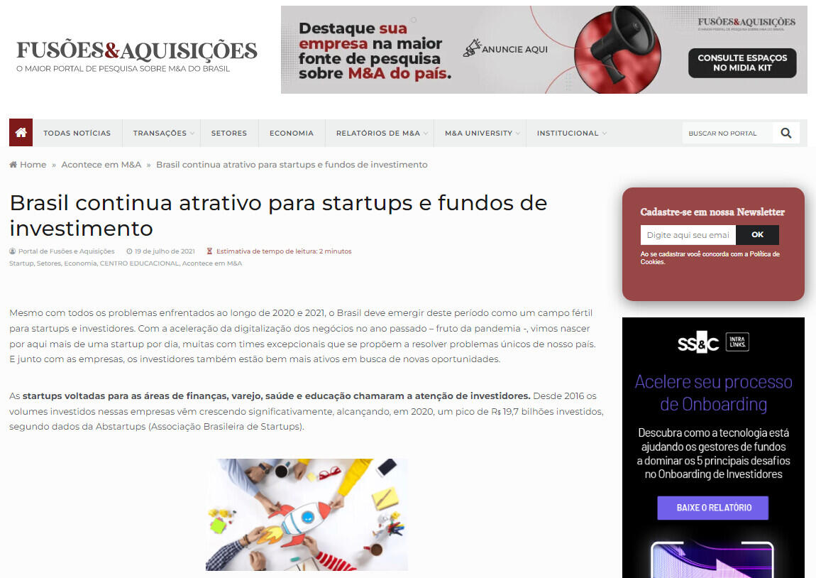 As startups voltadas para as áreas de finanças, varejo, saúde e educação chamaram a atenção de investidores. Desde 2016 os volumes investidos nessas empresas vêm crescendo significativamente, alcançando, em 2020, um pico de R﹩ 19,7 bilhões investidos, segundo dados da Abstartups (Associação Brasileira de Startups).