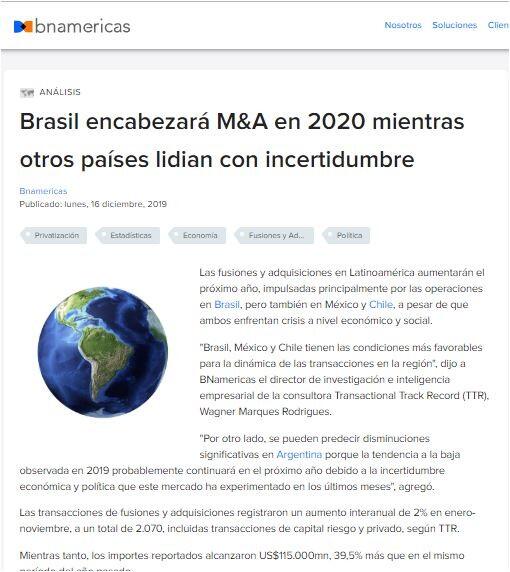 Brasil encabezará M&A en 2020 mientras otros países lidian con incertidumbre