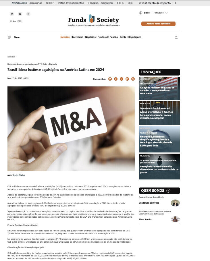 Apesar da liderança, o país teve uma queda de 21% na quantidade de operações em relação a 2023, conforme dados do relatório da Aon, realizado em parceria com a TTR Data e a Datasite.