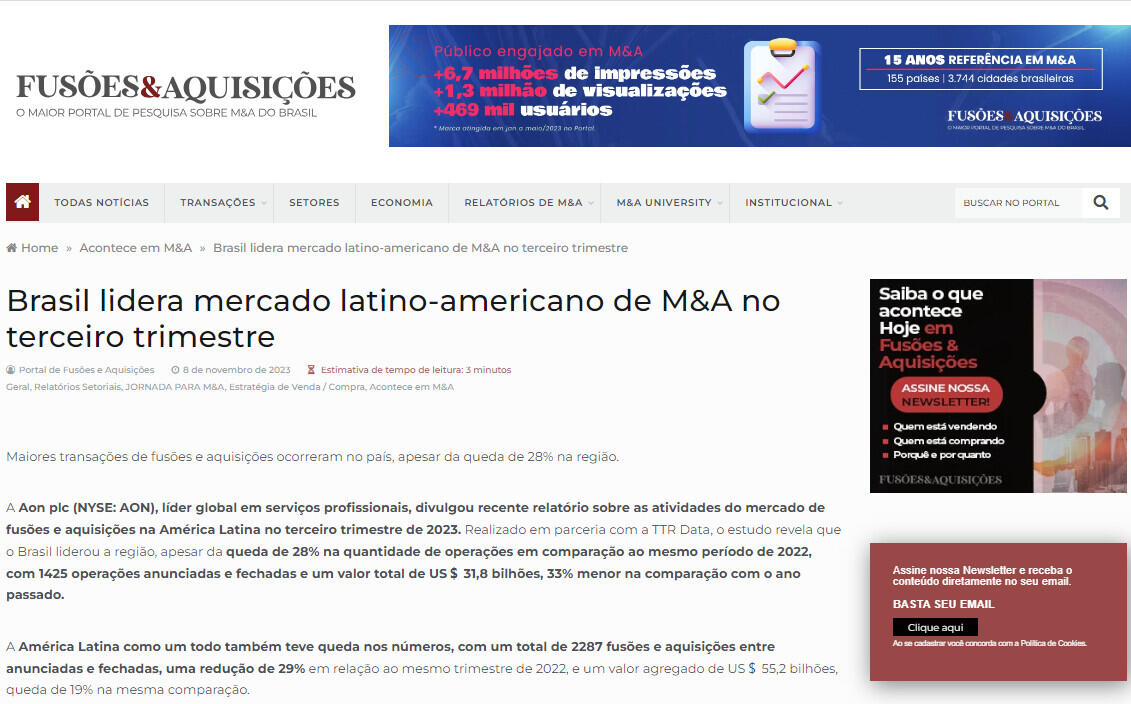 A Aon plc (NYSE: AON), líder global em serviços profissionais, divulgou recente relatório sobre as atividades do mercado de fusões e aquisições na América Latina no terceiro trimestre de 2023. Realizado em parceria com a TTR Data, o estudo revela que o Brasil liderou a região, apesar da queda de 28% na quantidade de operações em comparação ao mesmo período de 2022, com 1425 operações anunciadas e fechadas e um valor total de US$ 31,8 bilhões, 33% menor na comparação com o ano passado.