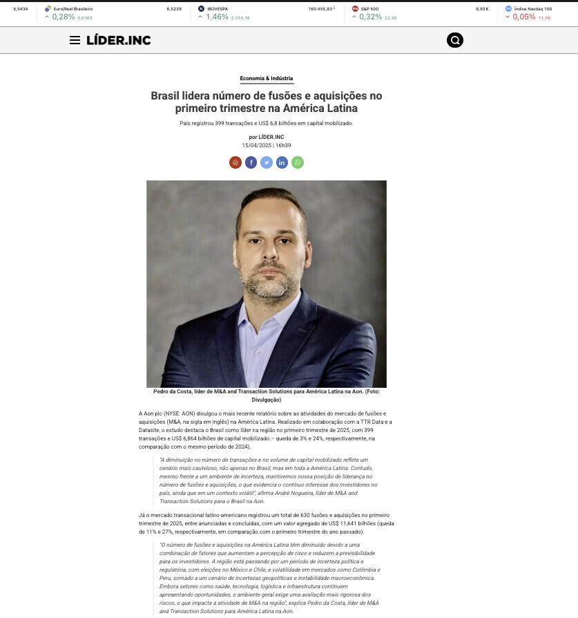"A diminuição no número de transações e no volume de capital mobilizado reflete um cenário mais cauteloso, não apenas no Brasil, mas em toda a América Latina. Contudo, mesmo frente a um ambiente de incerteza, mantivemos nossa posição de liderança no número de fusões e aquisições, o que evidencia o contínuo interesse dos investidores no país, ainda que em um contexto volátil", afirma André Nogueira, líder de M&A and Transaction Solutions para o Brasil na Aon.
