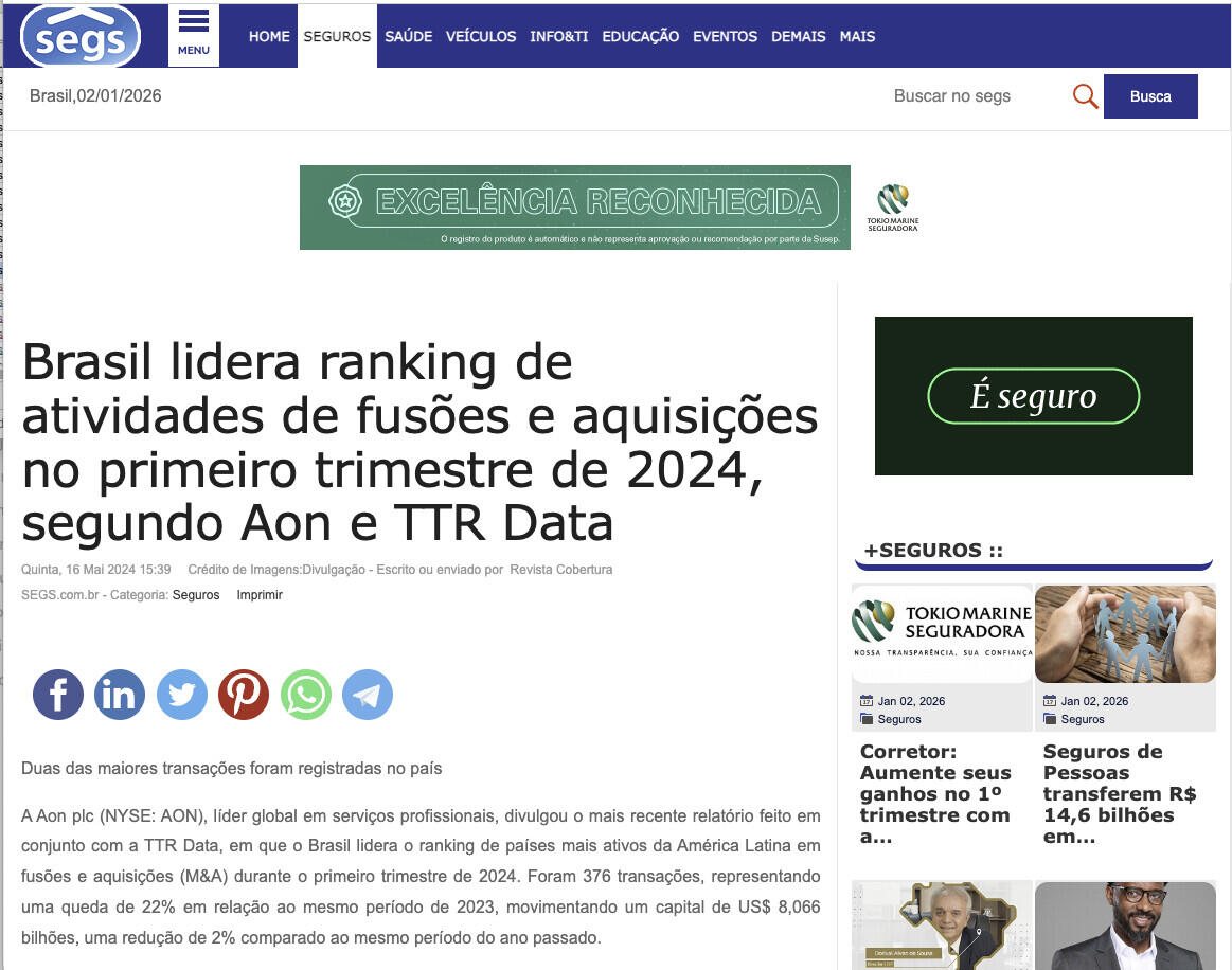 Para mais informações do primeiro relatório trimestral de 2024 sobre fusões e aquisições na América Latina, realizado pela TTR Data e Aon, clique aqui.