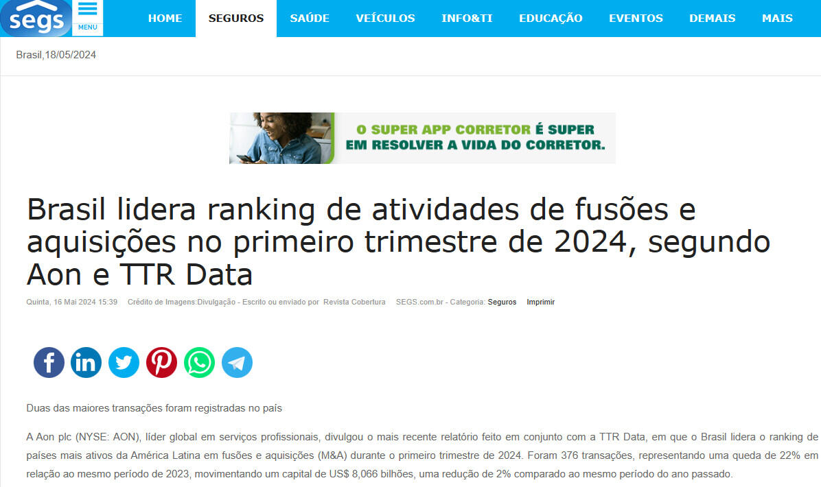 Brasil lidera ranking de atividades de fusões e aquisições no primeiro trimestre de 2024, segundo Aon e TTR Data