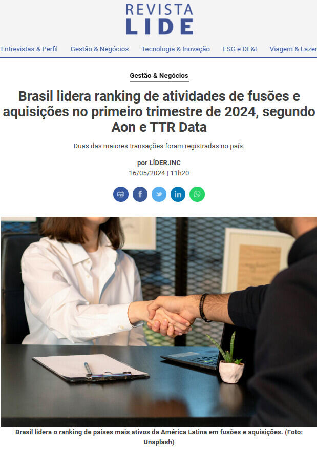 Brasil lidera ranking de atividades de fusões e aquisições no primeiro trimestre de 2024, segundo Aon e TTR Data
