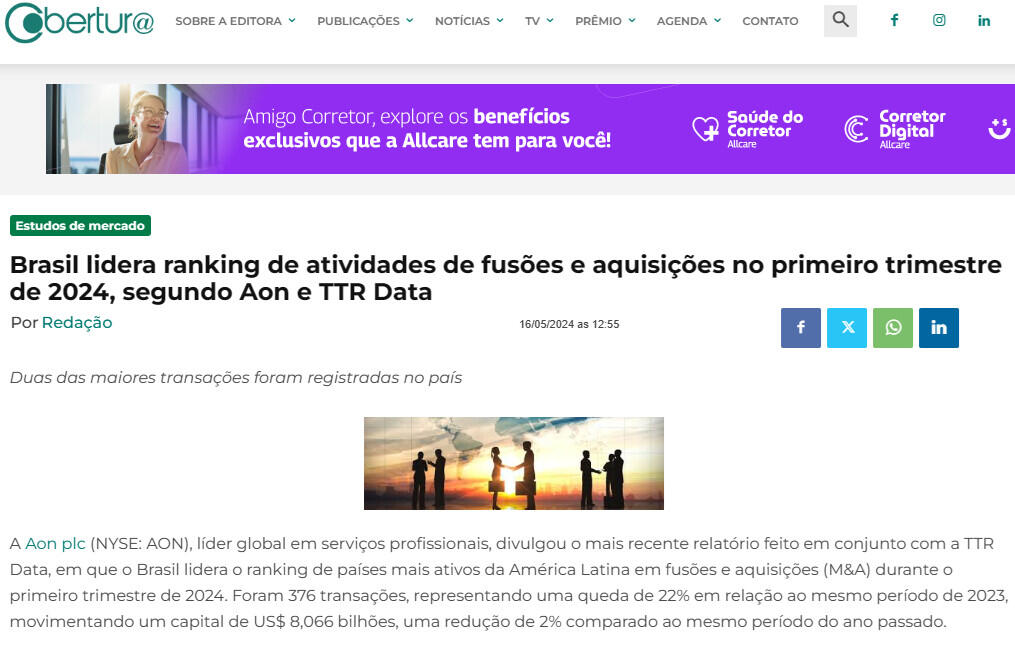 Brasil lidera ranking de atividades de fusões e aquisições no primeiro trimestre de 2024, segundo Aon e TTR Data