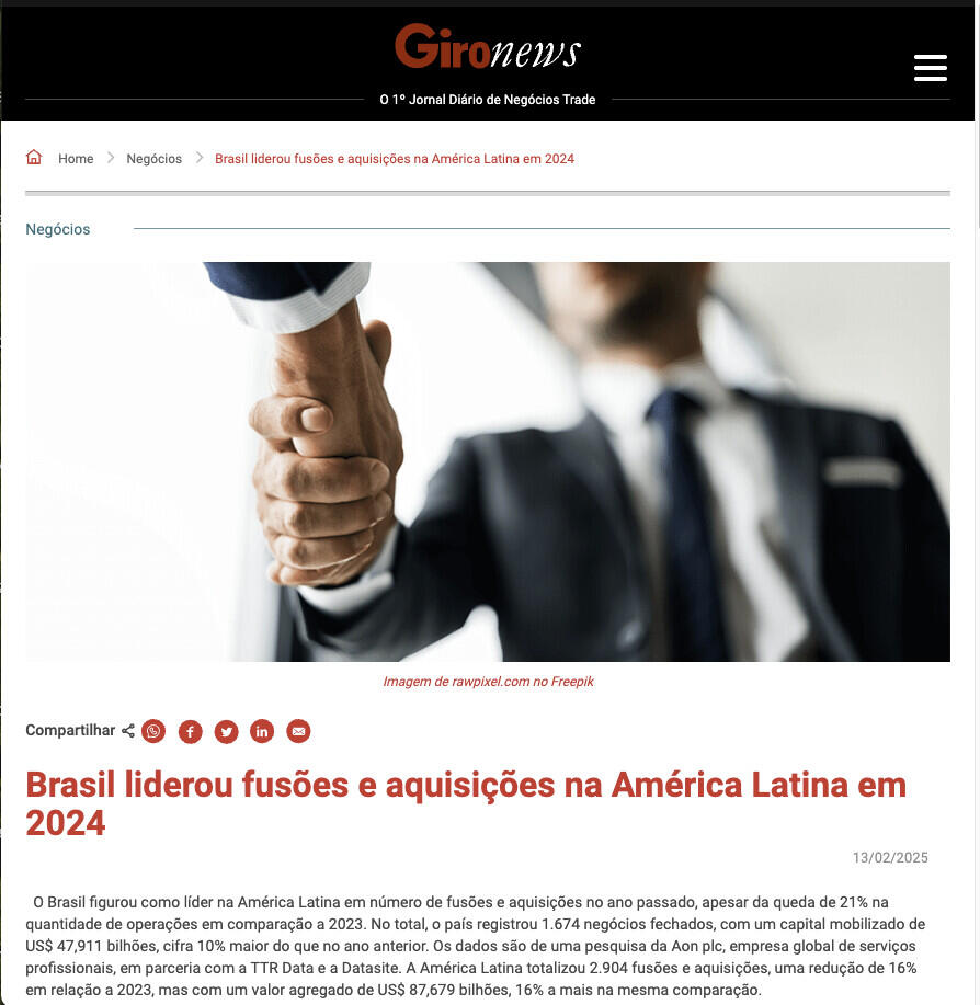 Brasil liderou fusões e aquisições na América Latina em 2024