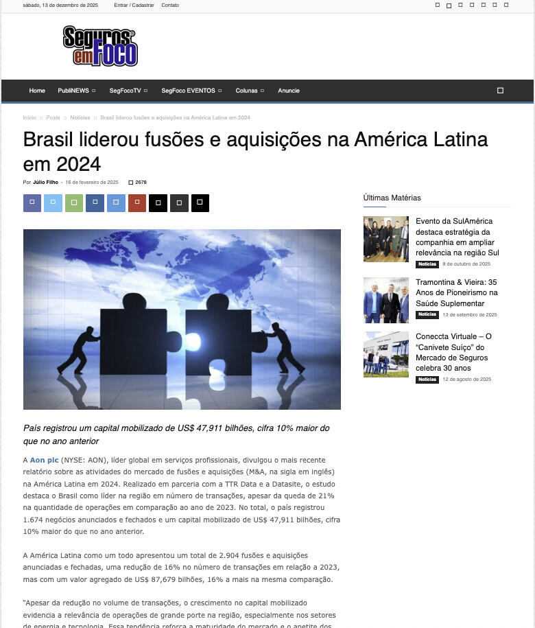 Para mais informações sobre o relatório completo de 2024 sobre fusões e aquisições na América Latina, realizado pela Aon e TTR Data, clique aqui.