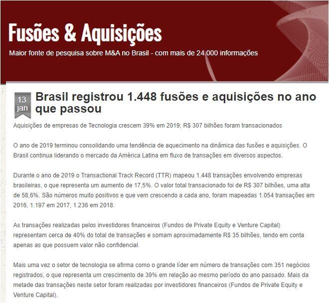 Durante o ano de 2019 o Transactional Track Record (TTR) mapeou 1.448 transações envolvendo empresas brasileiras, o que representa um aumento de 17,5%. O valor total transacionado foi de R$ 307 bilhões, uma alta de 58,6%. São números muito positivos e que vem crescendo a cada ano, foram mapeadas 1.054 transações em 2016, 1.197 em 2017, 1.236 em 2018.