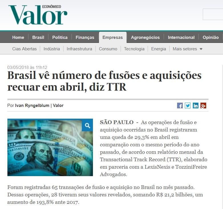 SÃO PAULO - As operações de fusão e aquisição ocorridas no Brasil registraram uma queda de 29,3% em abril em comparação com o mesmo período do ano passado, de acordo com relatório mensal da Transactional Track Record (TTR), elaborado em parceria com a LexisNexis e TozziniFreire Advogados.