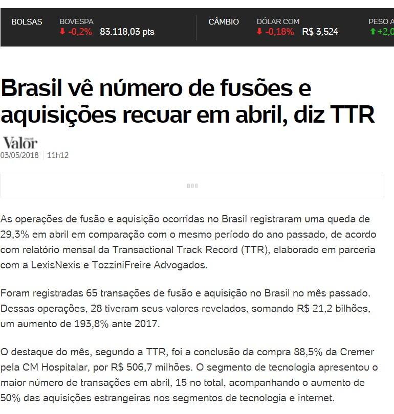 O destaque do mês, segundo a TTR, foi a conclusão da compra 88,5% da Cremer pela CM Hospitalar, por R$ 506,7 milhões. O segmento de tecnologia apresentou o maior número de transações em abril, 15 no total, acompanhando o aumento de 50% das aquisições estrangeiras nos segmentos de tecnologia e internet.