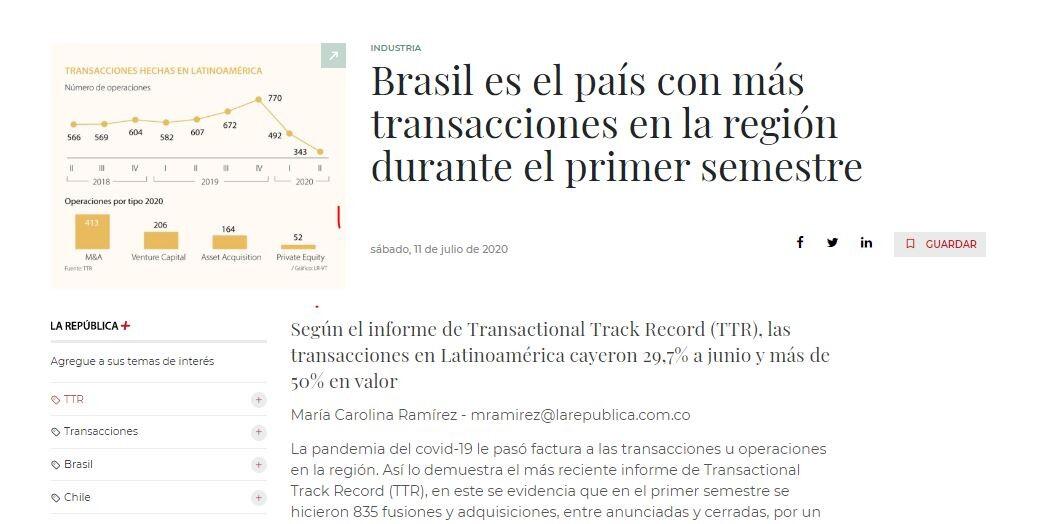 Hasta el segundo trimestre de 2020, por número de operaciones, Brasil lidera el ranking de países más activos de la región con 514 operaciones (disminución del 25%), y una baja del 67% en el capital movilizado en términos interanuales (US$11.028 millones).