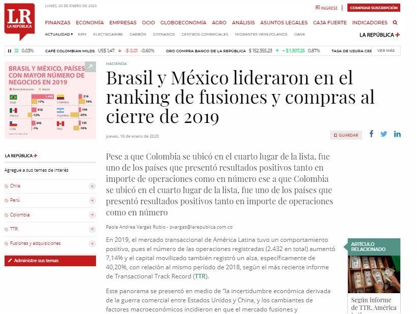 En 2019, el mercado transaccional de América Latina tuvo un comportamiento positivo, pues el número de las operaciones registradas (2.432 en total) aumentó 7,14% y el capital movilizado también registró un alza, específicamente de 40,20%, con relación al mismo período de 2018, según el más reciente informe de Transactional Track Record (TTR).