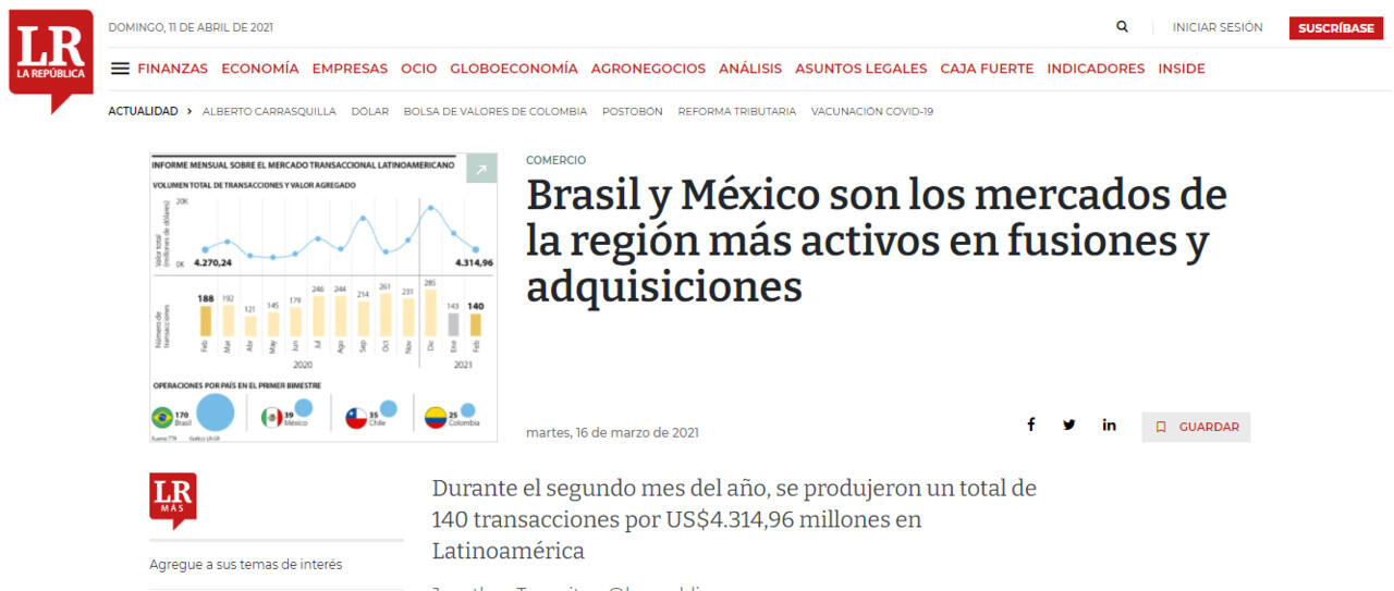 De acuerdo con el ultimo informe mensual de Transactional Track Record, el mercado de fusiones y adquisiciones (M&A, por siglas en inglés) en América Latina ha contabilizado en febrero de 2021 un total de 140 fusiones y adquisiciones, entre anunciadas y cerradas, por un valor de US$4.314 millones.