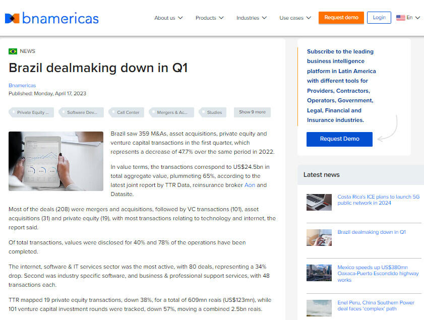 Brazil saw 359 M&As, asset acquisitions, private equity and venture capital transactions in the first quarter, which represents a decrease of 47.7% over the same period in 2022.