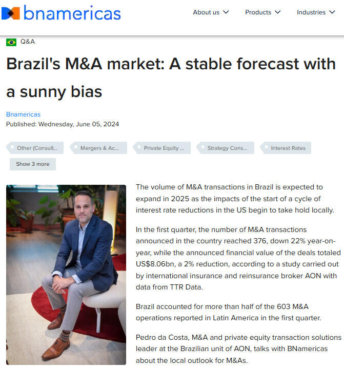 Pedro da Costa, M&A and private equity transaction solutions leader at the Brazilian unit of AON, talks with BNamericas about the local outlook for M&As.