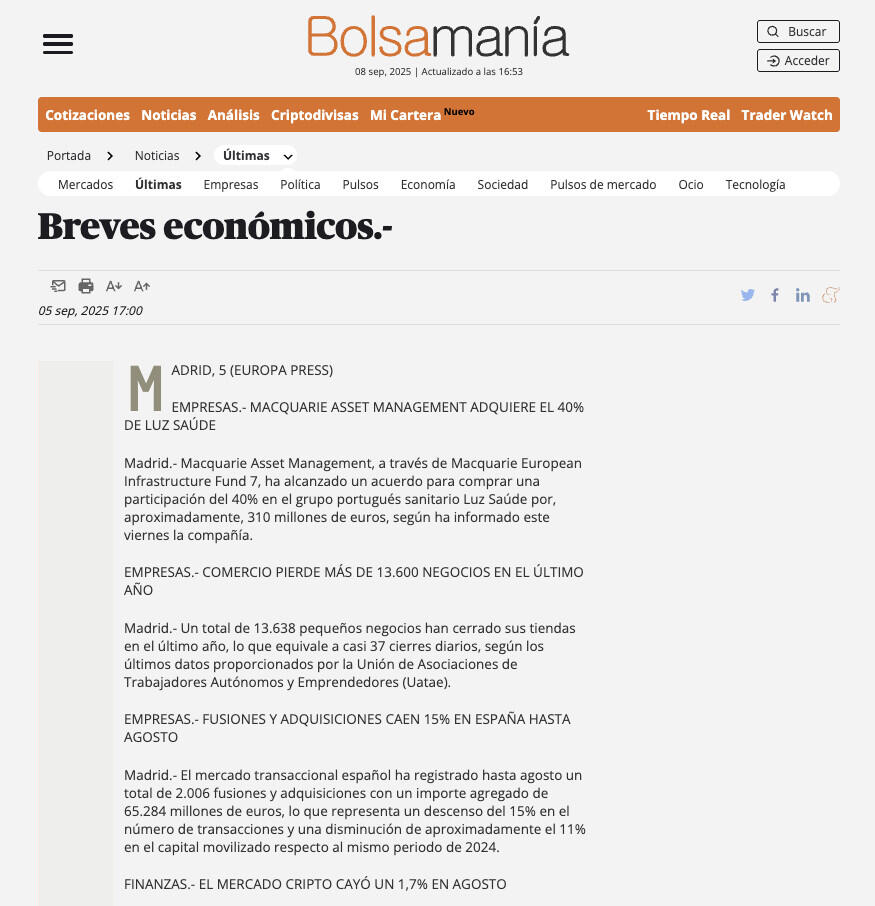 EMPRESAS.- MACQUARIE ASSET MANAGEMENT ADQUIERE EL 40% DE LUZ SAÚDE