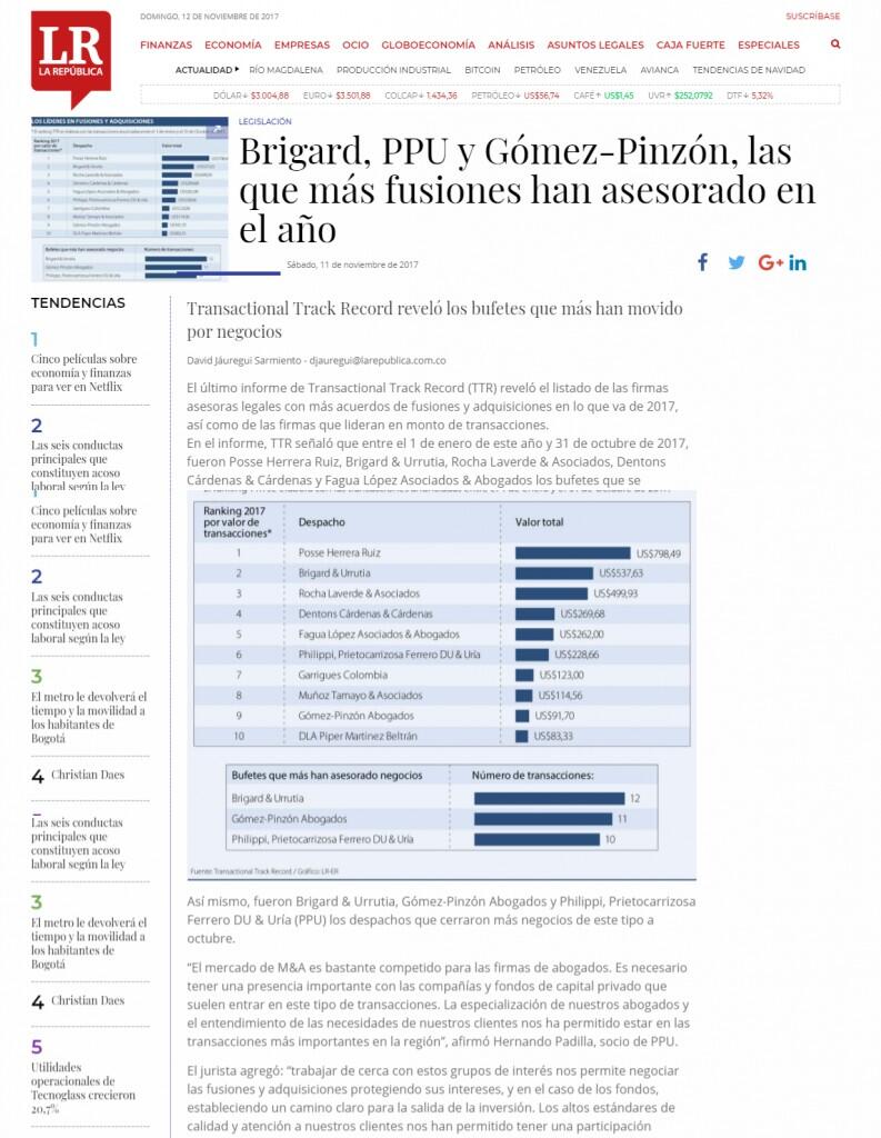En el informe, TTR señaló que entre el 1 de enero de este año y 31 de octubre de 2017, fueron Posse Herrera Ruiz, Brigard & Urrutia, Rocha Laverde & Asociados, Dentons Cárdenas & Cárdenas y Fagua López Asociados & Abogados los bufetes que se posicionaron en el top 5 de firmas con sumas más altas por asesoras transacciones.