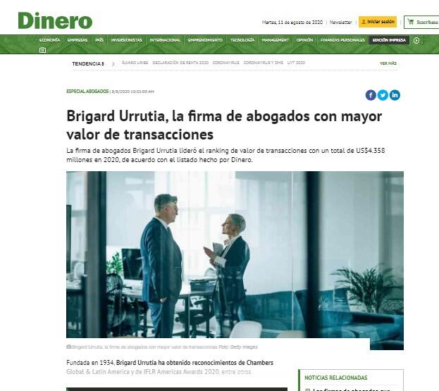 La firma de abogados Brigard Urrutia lideró el ranking de valor de transacciones con un total de US$4.358 millones en 2020, de acuerdo con el listado hecho por Dinero.