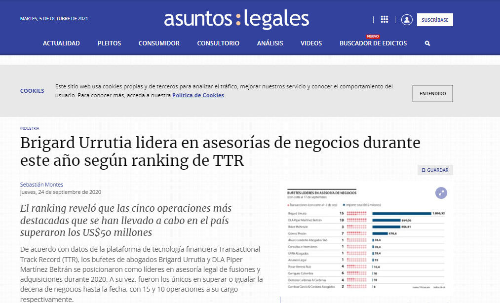 De acuerdo con datos de la plataforma de tecnología financiera Transactional Track Record (TTR), los bufetes de abogados Brigard Urrutia y DLA Piper Martínez Beltrán se posicionaron como líderes en asesoría legal de fusiones y adquisiciones durante 2020. A su vez, fueron los únicos en superar o igualar la decena de negocios hasta la fecha, con 15 y 10 operaciones a su cargo respectivamente.