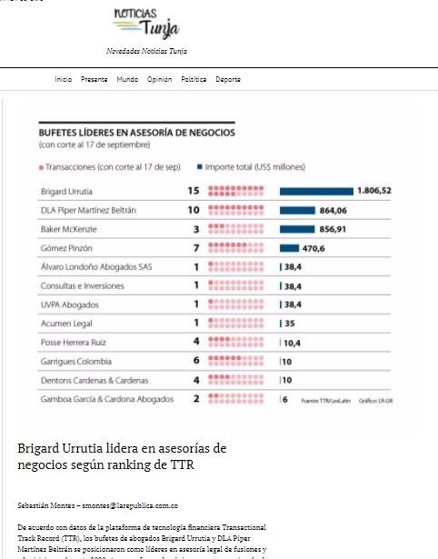 De acuerdo con datos de la plataforma de tecnología financiera Transactional Track Record (TTR), los bufetes de abogados Brigard Urrutia y DLA Piper Martínez Beltrán se posicionaron como líderes en asesoría legal de fusiones y adquisiciones durante 2020. A su vez, fueron los únicos en superar o igualar la decena de negocios hasta la fecha, con 15 y 10 operaciones a su cargo respectivamente.
