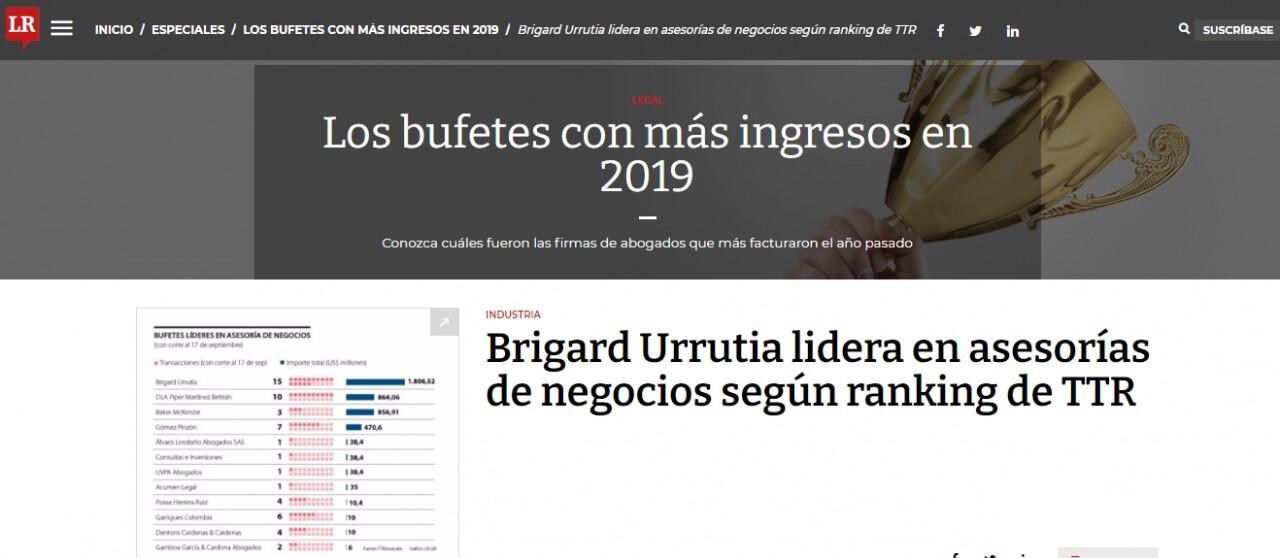 Brigard Urrutia lidera en asesorías de negocios según ranking de TTR