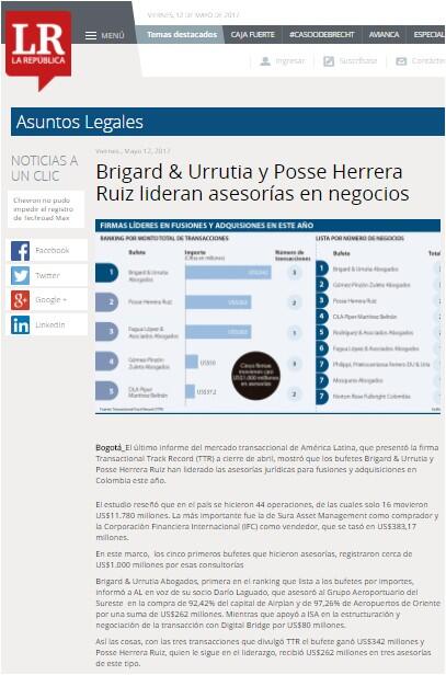 Bogotá_El último informe del mercado transaccional de América Latina, que presentó la firma Transactional Track Record (TTR) a cierre de abril, mostró que los bufetes Brigard & Urrutia y Posse Herrera Ruiz han liderado las asesorías jurídicas para fusiones y adquisiciones en Colombia este año.
