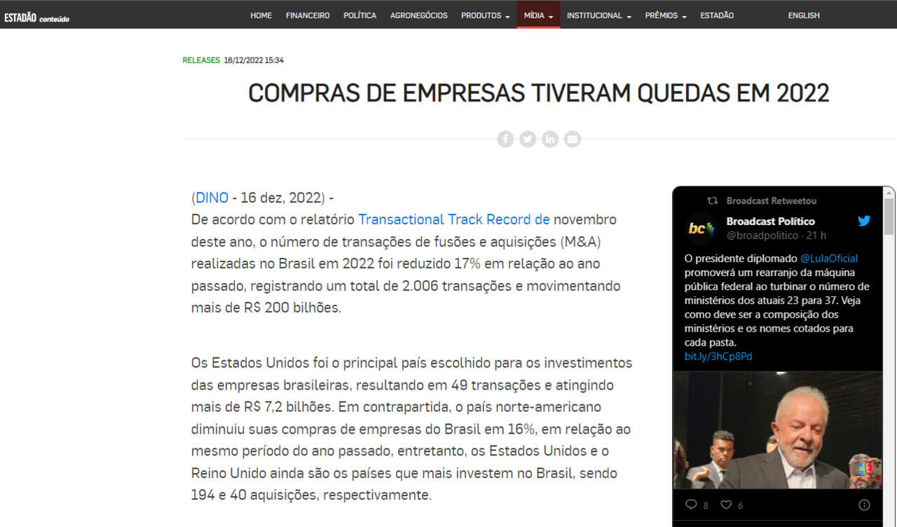 De acordo com o relatório Transactional Track Record de novembro deste ano, o número de transações de fusões e aquisições (M&A) realizadas no Brasil em 2022 foi reduzido 17% em relação ao ano passado, registrando um total de 2.006 transações e movimentando mais de R$ 200 bilhões.